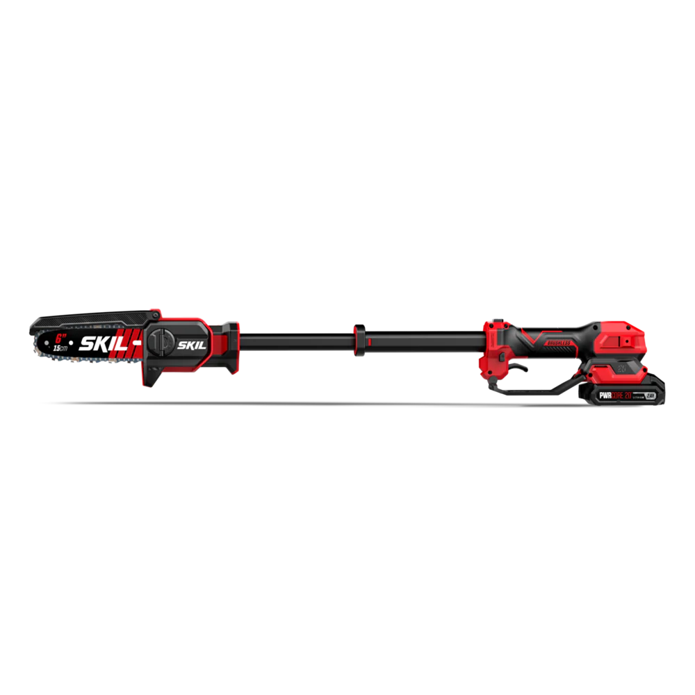 Reach for the SKIL PWRCORE 20™ Brushless 20V 6 In. Telescopic Pruning Saw for light-duty pruning needs. The cordless pruning saw is equipped with a 6-inch bar and chain, and its pole extends up to 2.8 feet in total length for up to 7 feet of cutting reach. Its compact and lightweight profile delivers maximum cutting versatility. Its powerful brushless motor delivers up to 115 cuts per charge with the included PWRCORE 20™ 2.0Ah battery. Tool-free chain tensioning allows chain adjustments with the simple twist of a dial. IPX4 water resistance adds durability for use in inclement weather. It comes with an EASYSTORAGE bracket to conveniently store and organize all your SKIL PWRCORE 20™ outdoor power equipment. The kit includes the 6-inch cordless telescopic pruning saw, PWRCORE 20™ 2.0Ah battery, and PWRCORE 20™ 20V Standard Charger.